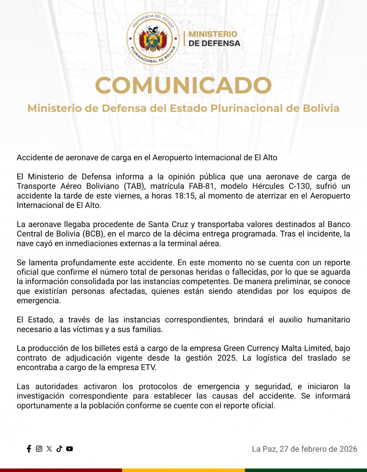 COMUNICADO DE PRENSA Accidente de aeronave de carga en el Aeropuerto Internacional de El Alto El Ministerio de Defensa informa a la opinión pública que una aeronave de carga de Transporte Aéreo Boliviano (TAB), matrícula FAB-81, modelo Hércules C-130, sufrió un accidente la tarde de este viernes, a horas 18:15, al momento de aterrizar en el Aeropuerto Internacional de El Alto. La aeronave llegaba procedente de Santa Cruz y transportaba valores destinados al Banco Central de Bolivia (BCB), en el marco de la décima entrega programada. Tras el incidente, la nave cayó en inmediaciones externas a la terminal aérea. Se lamenta profundamente este accidente. En este momento no se cuenta con un reporte oficial que confirme el número total de personas heridas o fallecidas, por lo que se aguarda la información consolidada por las instancias competentes. De manera preliminar, se conoce que existirían personas afectadas, quienes están siendo atendidas por los equipos de emergencia. El Estado, a través de las instancias correspondientes, brindará el auxilio humanitario necesario a las víctimas y a sus familias. La producción de los billetes está a cargo de la empresa Green Currency Malta Limited, bajo contrato de adjudicación vigente desde la gestión 2025. La logística del traslado se encontraba a cargo de la empresa ETV. Las autoridades activaron los protocolos de emergencia y seguridad, e iniciaron la investigación correspondiente para establecer las causas del accidente. Se informará oportunamente a la población conforme se cuente con el reporte oficial.