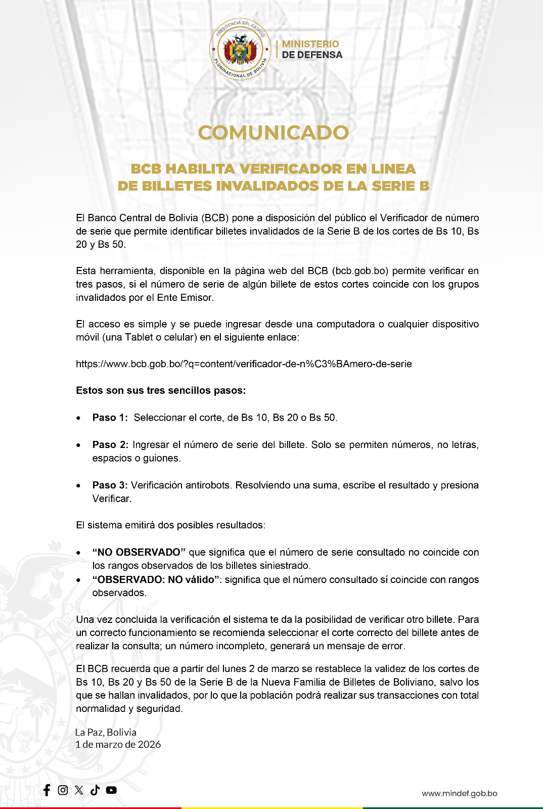 El Banco Central de Bolivia (BCB) pone a disposición del público el Verificador de número de serie, que permite identificar billetes invalidados de la Serie B de los cortes de Bs 10, 20 y 50.