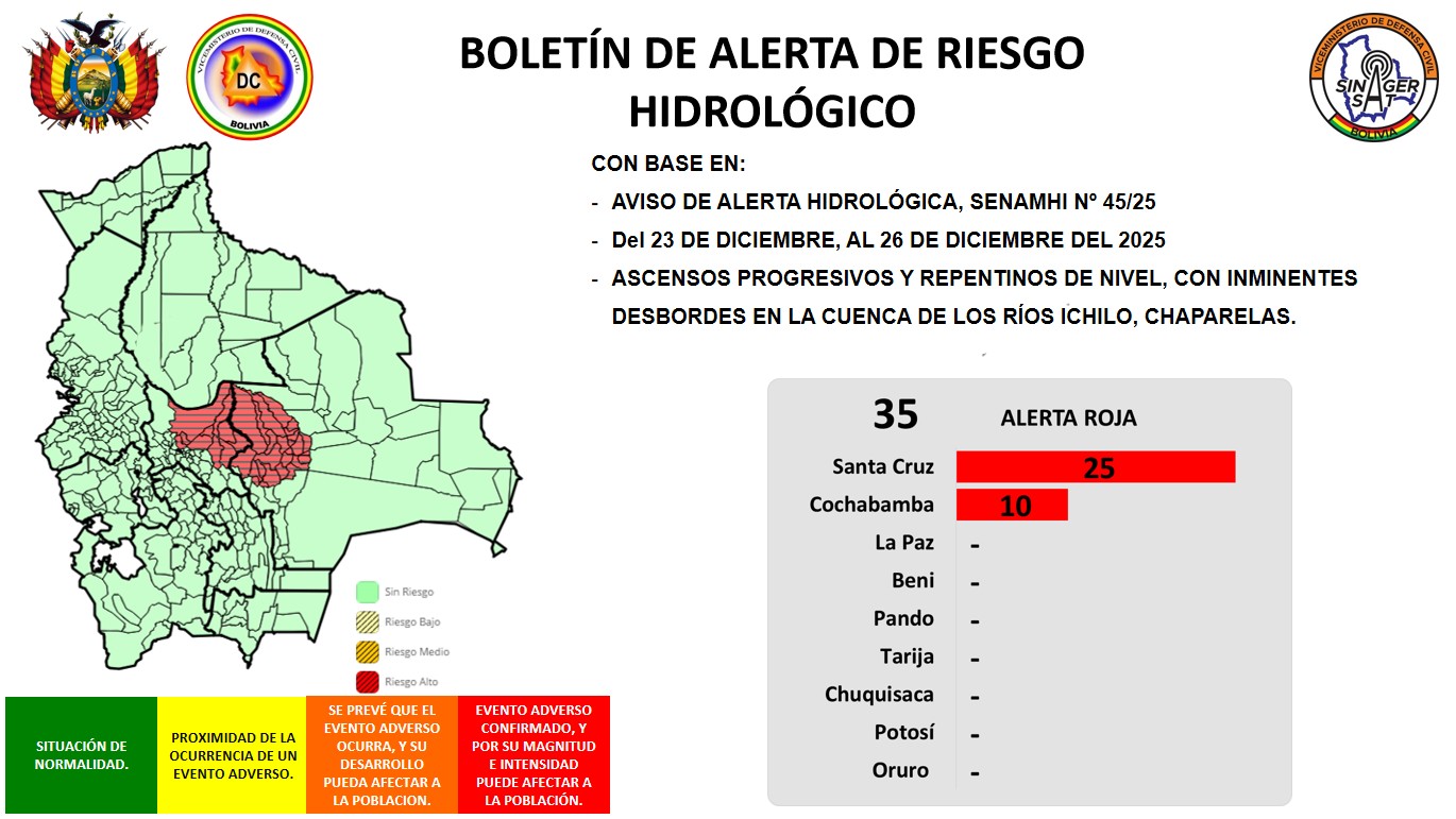 Alerta de riesgo hidrológico, con base en el aviso de la alerta hidrológica: SENAMHI Nº 45/25, del 23 de diciembre al 26 de diciembre del 2025. Se informa ascensos progresivos y repentinos de nivel, con inminentes desbordes en la cuenca de los ríos Ichilo, Chaparelas.