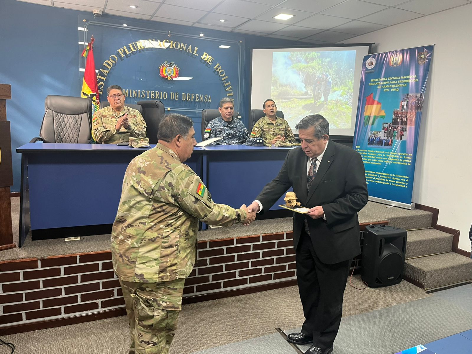 El señor Viceministro de Defensa y Cooperación al Desarrollo Integral, Gral. Brig. (S.P.) Simón Javier Rivera Eterovic, en representación del Señor Ministro de Defensa, encabezó la ceremonia de clausura del PRIMER CURSO DE RESPUESTA A INCIDENTES CON MATERIALES QUÍMICOS PELIGROSOS, organizado por la SECRETARIA TÉCNICA NACIONAL DE LA ORGANIZACIÓN PARA LA PROHIBICIÓN DE LAS ARMAS QUÍMICAS al mando del Sr. My. DIM. Alvaro Fernando Soria Toranzos, dirigido al personal de cuadros del CEO QBRN CEL Comando en Jefe de las Fuerzas Armadas de Bolivia. Este curso, tuvo como objetivo preparar a los participantes para enfrentar y responder a incidentes relacionados con sustancias químicas peligrosas.