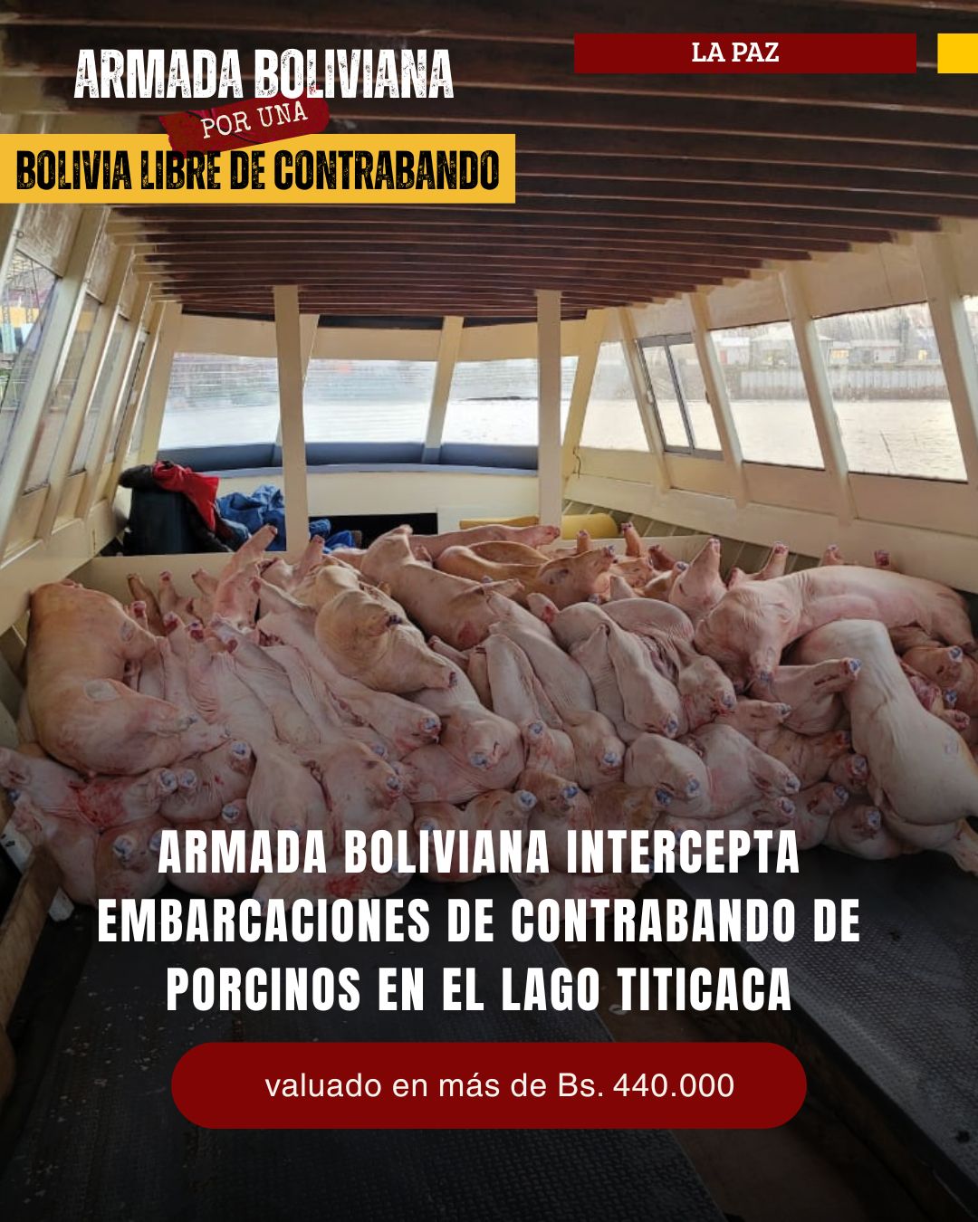 Durante el patrullaje, se procedió al abordaje de dos embarcaciones civiles que se encontraban ocultas entre los totorales. En la inspección se constató que una de ellas transportaba 128 cerdos faenados y la otra, 60 cerdos vivos; en ningún caso, contaban con documentación legal ni tripulación a bordo. Como resultado de este operativo, se efectuó un golpe al contrabando  valuado en aproximadamente de Bs 440.000.